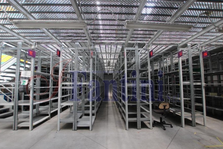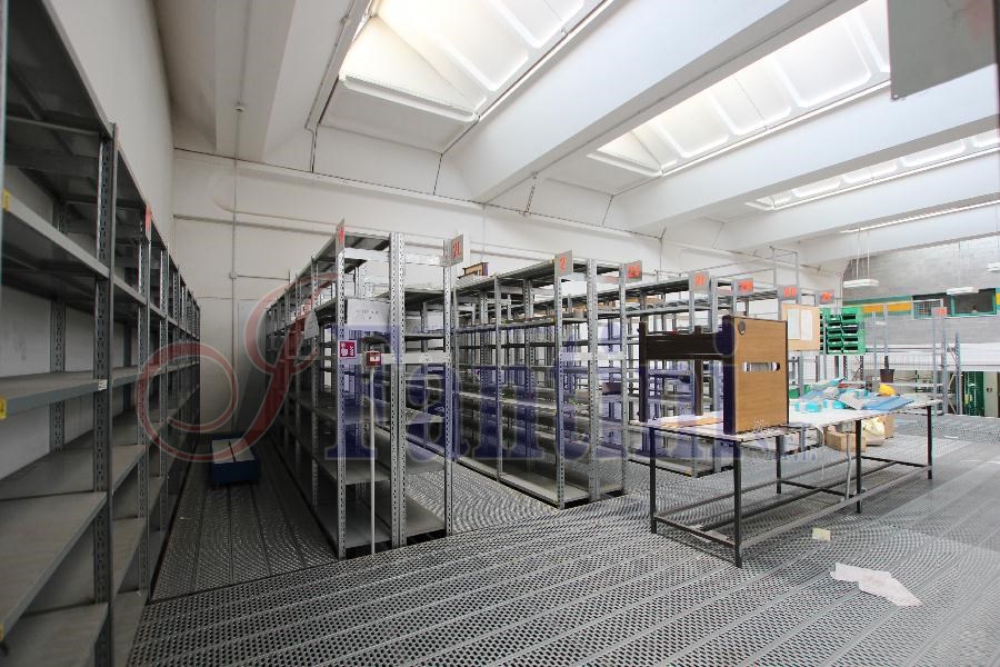 Area magazzino con scaffalatura verticale, reception, uffici e servizi.
